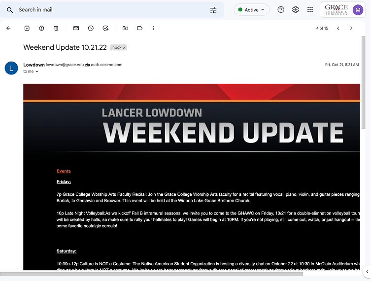 Twice a week, students get an email detailing various campus-wide extracurricular, fun, and sporting events. Unfortunately, this email does not feature responsive design, so depending on your device, the email ranges from mildly annoying to read to completely illegible on small mobile devices. This is a problem because students have a harder time reading the email and may miss out on social events that may have been interesting. Additionally, those people running the events have less of an opportunity to get good engagement and outcomes at their event.
