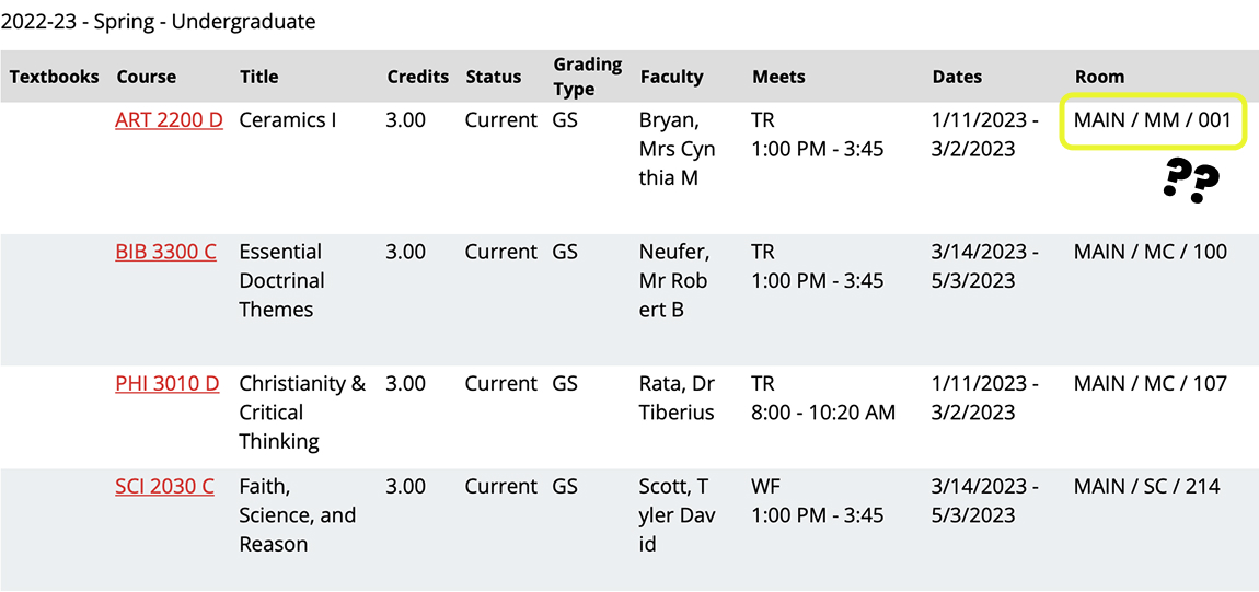 When a student views their courses on the student portal, the location is only listed as the building’s abbreviation and the room number. If a student is not already familiar with the building’s abbreviation and physical location, they don’t have an easy way to find out where their class is. This is a problem because it adds unnecessary stress, frustration, and anxiety to a student’s life. Students may accidently show up to the wrong building on the day of class and not know where to go or eventually show up late to class. Additionally, professors have to take extra time out of their busy days answering a multitude of student emails with directions to their class.